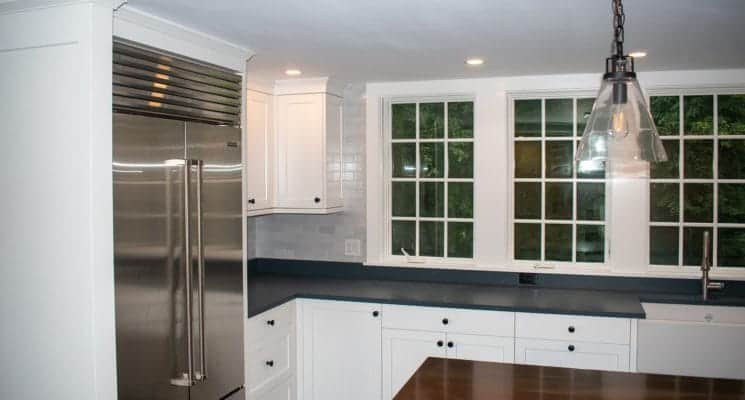 Professionally painted kitchen cabinets. We sprayed these kitchen cabinets using Benjamin Moore advance Semi, Snow White. A great product and color for your kitchens. It’s sandable, easy to apply. Snow White is part of the Off-White Color collection by Benjamin Moore. If you are in search of kitchen cabinet painters near you, contact us today!